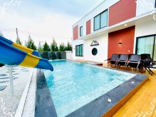 บ้านพักมี 5 ห้องนอน 4 ห้องน้ำ รองรับผู้เข้าพักได้ 14 ท่านเสริมได้ 6 ท่าน มีสระว่ายน้ำส่วนตัว มีสไลเดอร์ บริการ!! ชุดคาราโอเกะ และ โต๊ะสนุ๊ก สามารถทำอาหารได้ อุปกรณ์ครัว เตาปิ้งย่างครบ มีมุมน...